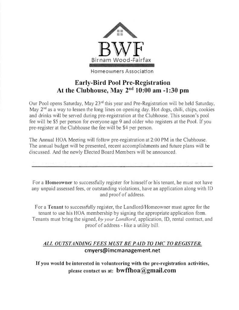 Reminder: Homeowner applications will be available at the Club House on May 2nd at the Annual Meeting of the Ballot Election of the Board of Directors for BWFF and available at the Pool House once the Pool is open.